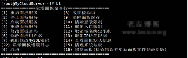 如果您觉得密码指令太长,且刚好您是安装的最新版本宝塔,可以直接执行 bt 指令,会显出是小工具,直接选择对应的工具编号即可。